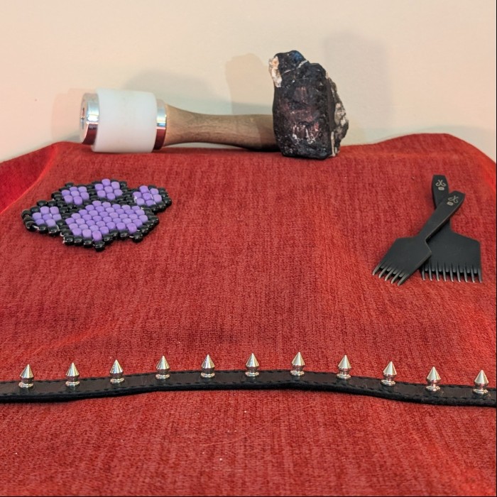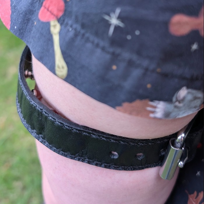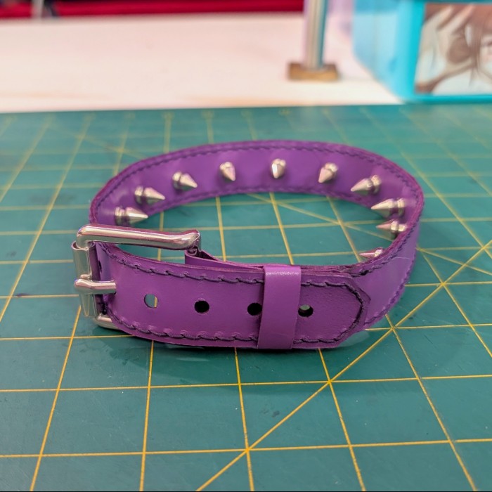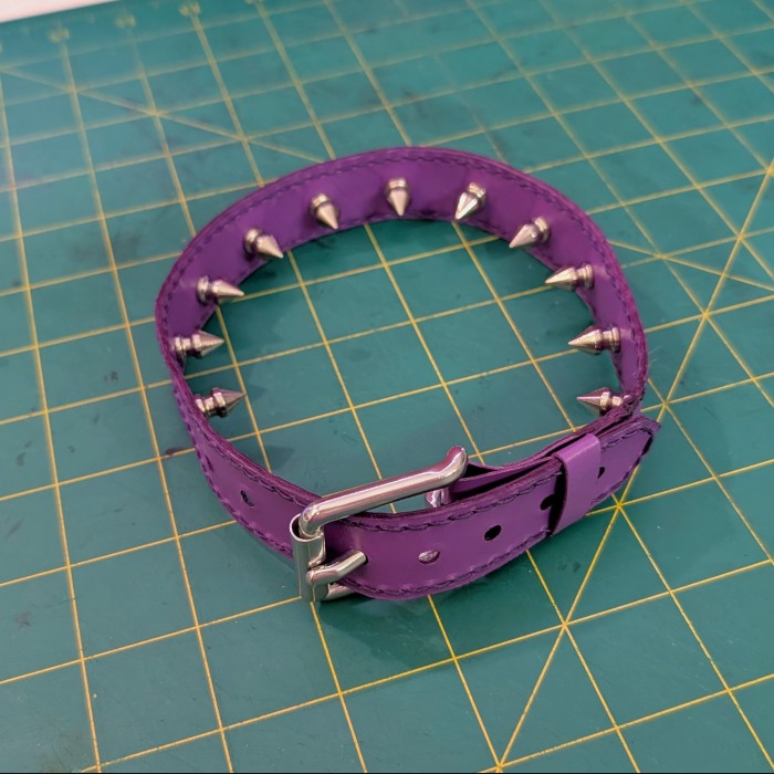 These spiked bicep cuffs are a masochist's dream. They inflict a dull ache while worn, and are very fun to hit during play. The spikes can leave small marks, will cause bruises if worn very tightly or for long periods of time, and have the potential to draw blood with extreme play. Please never use internally spiked gear on your neck or wrists, it is very dangerous to do so!